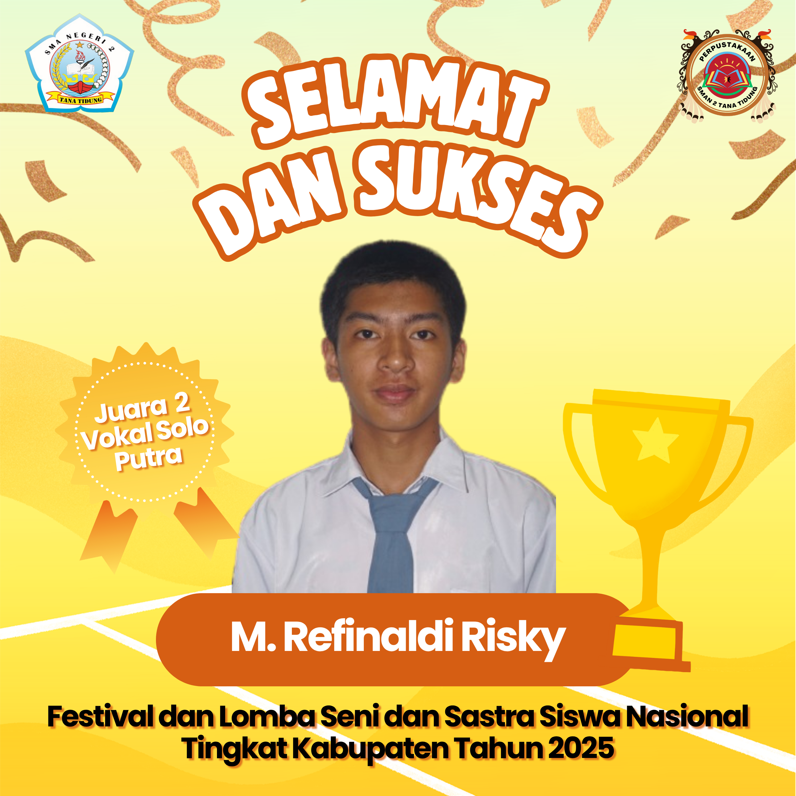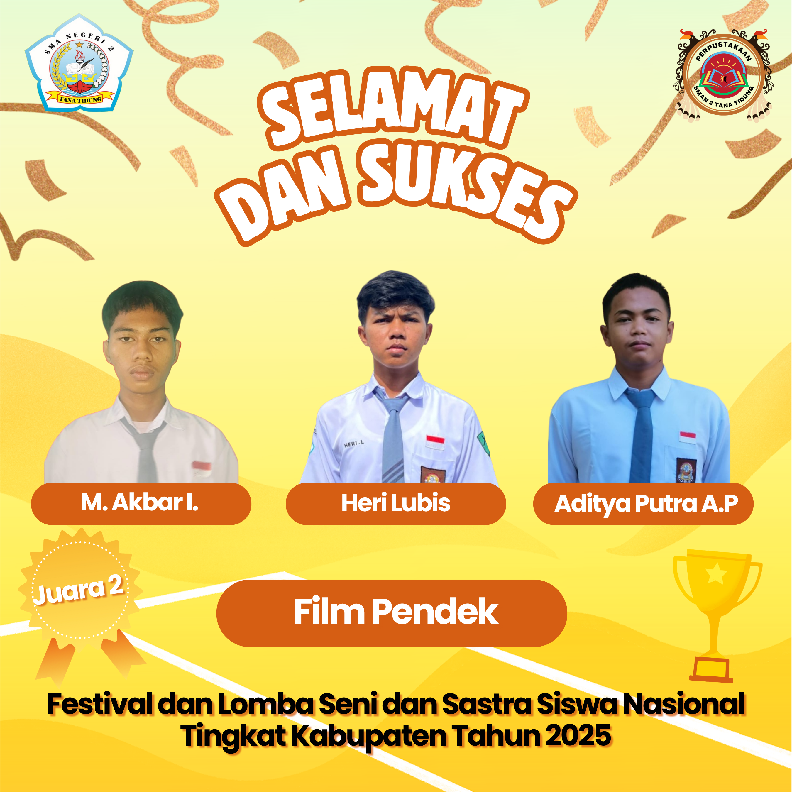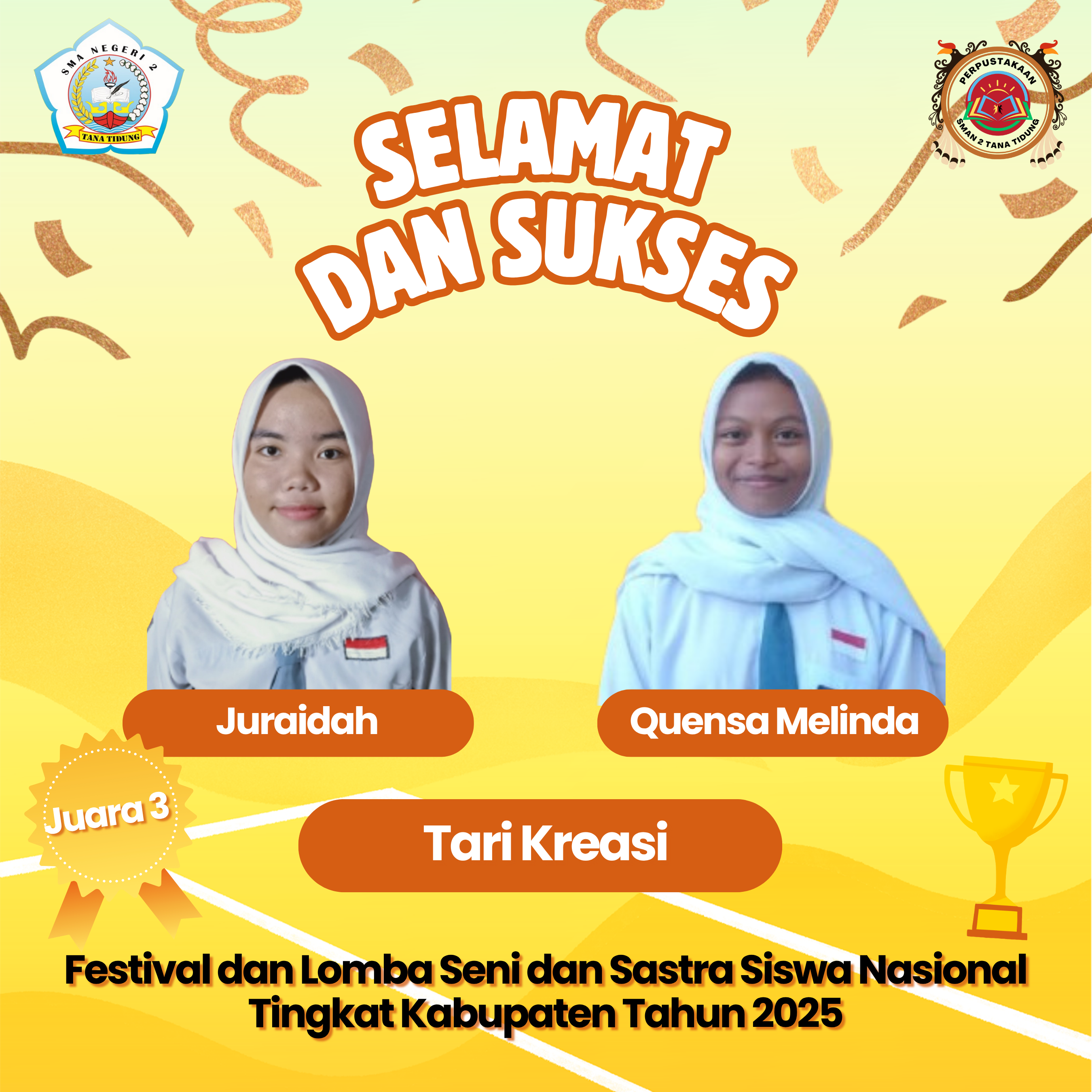Tana Tidung, 13 Juni 2025 — Prestasi membanggakan kembali diraih oleh siswa-siswi SMA Negeri 2 Tana Tidung setelah berhasil meraih juara dalam ajang Festival dan Lomba Seni dan Sastra Siswa Nasional (FLS3N) tingkat Kabupaten Tana Tidung yang digelar pada 10-11 Juni 2025.